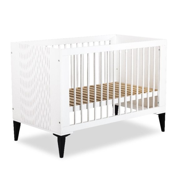 KLUPŚ MIA 120x60 – Białe łóżeczko dziecięce z ryflowanym szczytem i czarnymi nóżkami